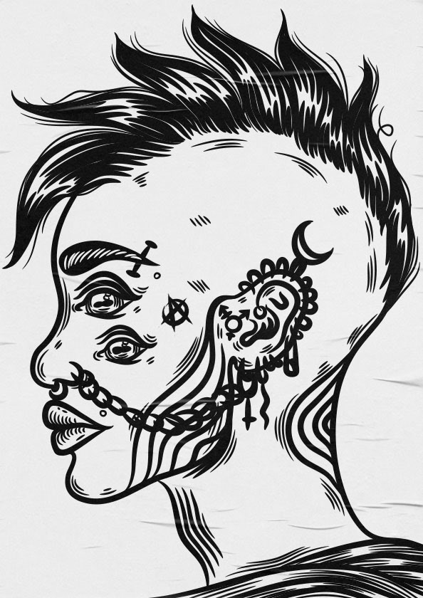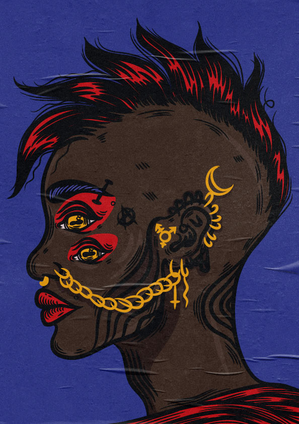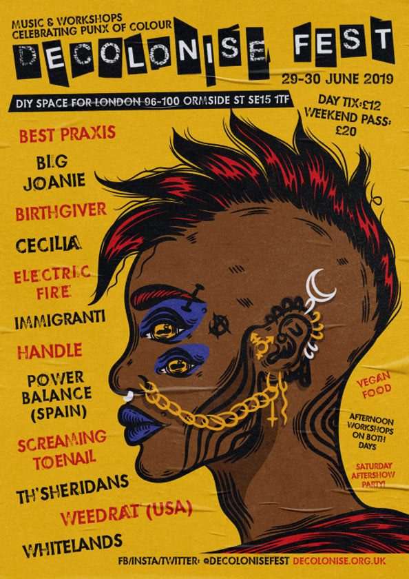 Poster created for Decolonize Festival London 2019. An annual DIY festival designed to represent, uplift and celebrate punx (non binary punk artists) of colour. https://decolonise.org.uk/