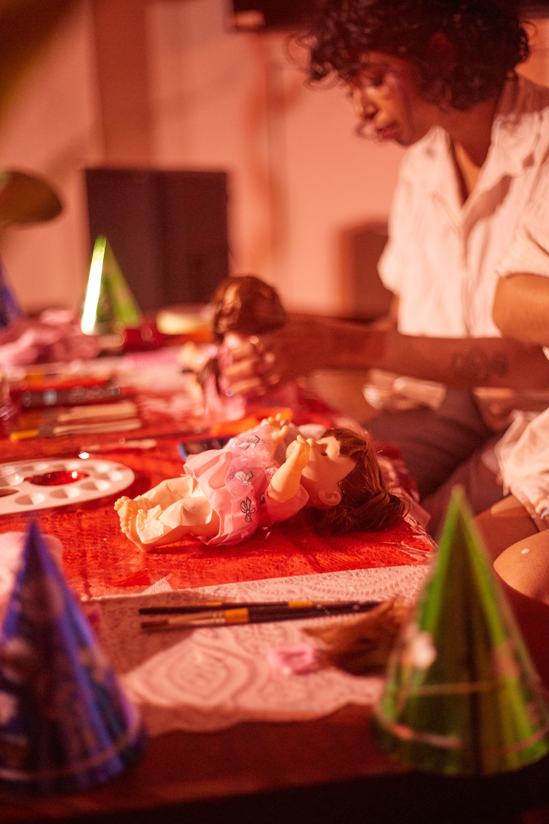 Home Science is a collaborative performance with sound artist Noni Mouse (Radha Priya), presented at Kaalo Residency, Nepal, and Method Gallery, Mumbai. The title derives from a common school course in India, where girls are taught domestic activities such as sewing, cooking, and home crafts, reinforcing traditional gender roles. This work interrogates the intergenerational transmission of trauma in South Asian societies, where women perpetuate gendered conditioning through care labor and self-sacrifice. Drawing from "Indian" cultural rituals, the performance critiques societal practices that "prepare" girls for patriarchal expectations, using dolls, textiles, paint, and music to reimagine these rituals as a poignant socio-cultural critique.