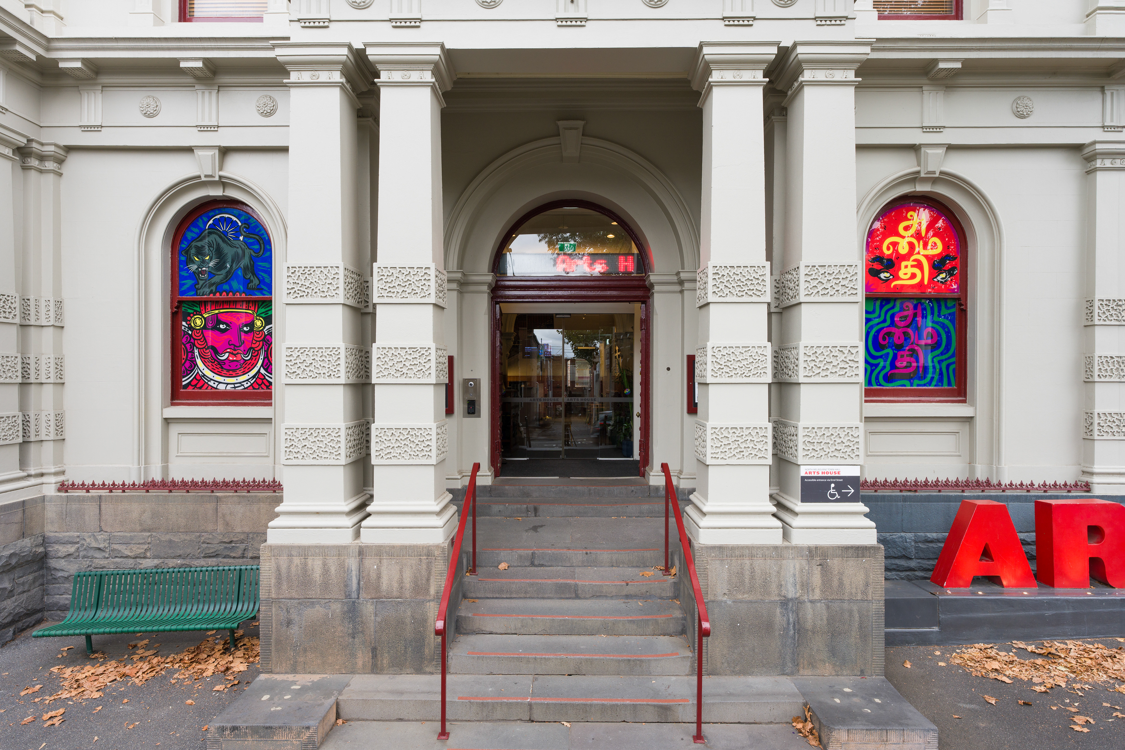 Commissioned by Arts House in Melbourne, Australia உயர்வு Uyirvu (‘growth and rise’) illustrates histories of resistance and futures filled with regenerative joy. In this window commission, Siva delves into the themes of hybridity, fluidity, affirmations and rest. Through the lens of speculative fiction, the imagery of lizards and Millet grass evoke concepts of regrowth and the cycles of nature. Central to the work are the Tamil texts, notably அமைதி Amaithy which evokes a sense of serenity, tranquillity and harmony. The typography மாவீரர் Maaveerar, accompanying the tiger, symbolises strength and warrior spirit, while ஒற்றுமை Ottrumai, accompanying the three headed snake, translates to togetherness. உயர்வு Uyirvu offers space to imagine joy as a multi-dimensional experience and gestures towards themes of unity, resilience and empowerment. Part of the exhibition ಒಡಲಾಳ Odalala (‘from the depths of one’s being’) curated by Vishal Kumaraswamy, brings together Australian and international artists to examine histories of caste, migration, gender and sexuality through contemporary expression. Unfolding across the entirety of Arts House during Dalit History Month, ಒಡಲಾಳ Odalala is a multi-format activation, featuring an exhibition, talks, screenings, communal meals and curator and accessible tours. https://www.artshouse.com.au/events/odalala/